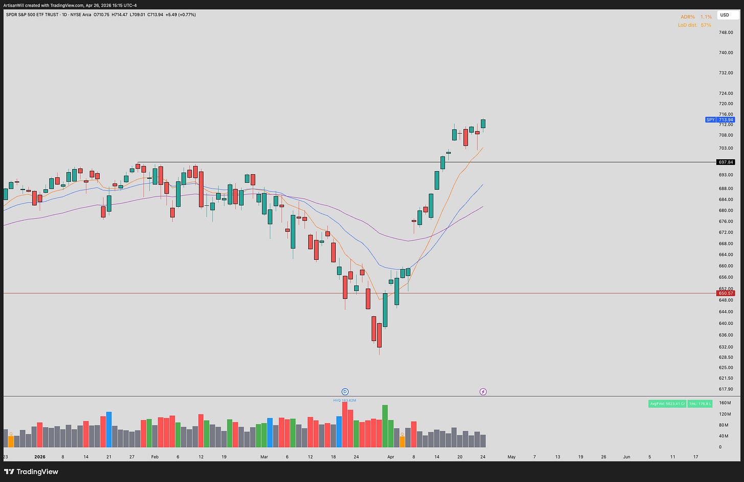 SPY 0.00%↑- The market retested the daily 9EMA Thursday and saw an aggressive buy reaction to new highs. This type of PA is representative of a strong uptrend and shows resilience of this trend. This is exactly what we want to see when dips are seen, they should be shallow and bought up quickly.