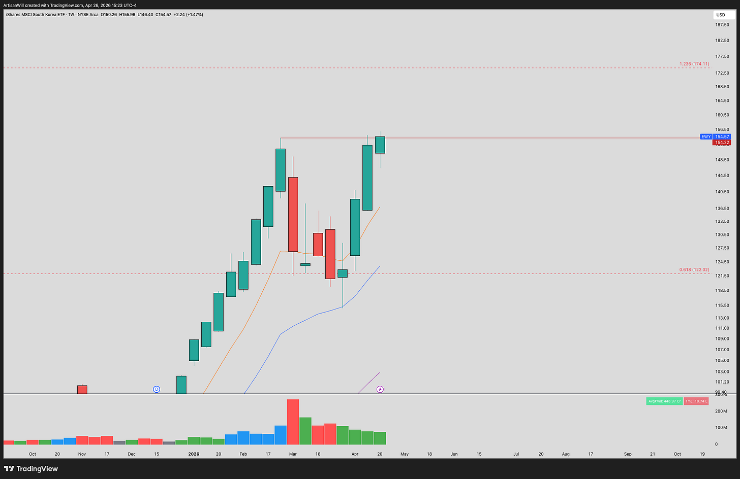 EWY 0.00%↑- This ETF just printed a highest weekly close ever with Samsung reporting ER this week. Expecting a continuation move on this as memory continues to become integral to the AI infrastructure build out.